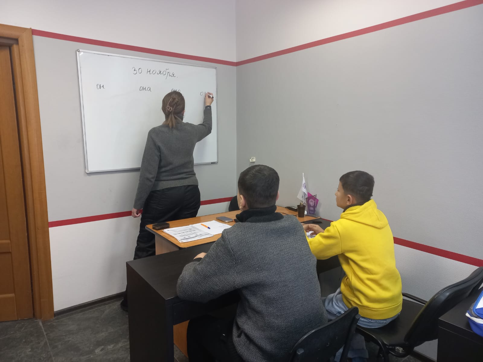 30 ноября прошло очередное занятие по русскому языку как иностранному в детской группе на площадке учебного центра "Алгоритм-С" с участием переводчика. На занятии повторяли род и число существительных.