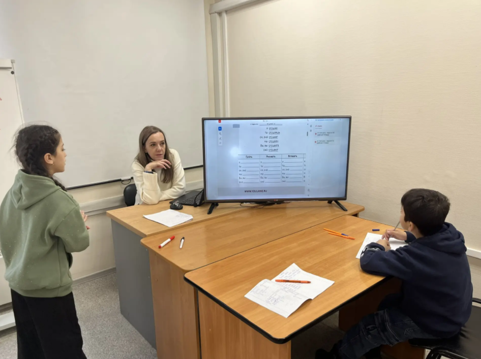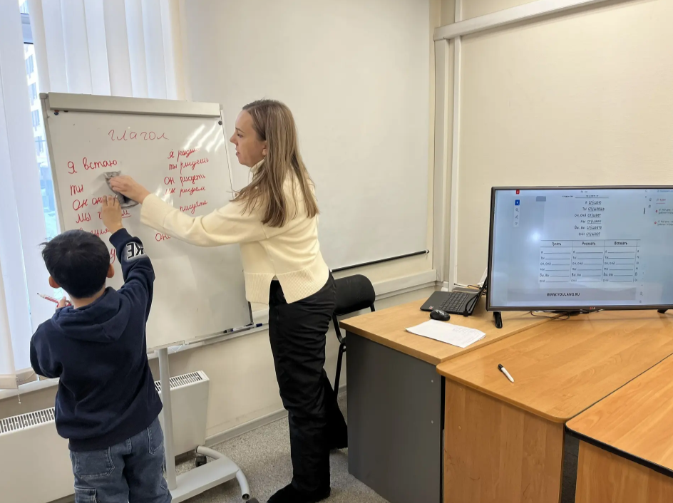 31 января прошло очередное занятие по русскому языку как иностранному в детской группе на площадке учебного центра "Алгоритм-С" с участием переводчика. На занятии изучали спряжение глаголов.